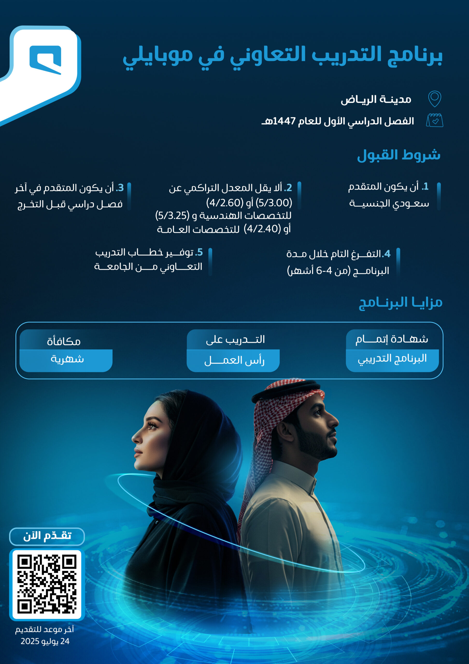 أعلنت شركة موبايلي عن فتح باب التقديم في برنامج التدريب التعاوني للفصل الدراسي الأول من العام 1447هـ بمدينة الرياض، يهدف إلى تمكين الطلاب والطالبات من تطبيق معارفهم الأكاديمية على تحديات حقيقية في بيئة العمل، وذلك وفقاً للتفاصيل الموضحة أدناه.
