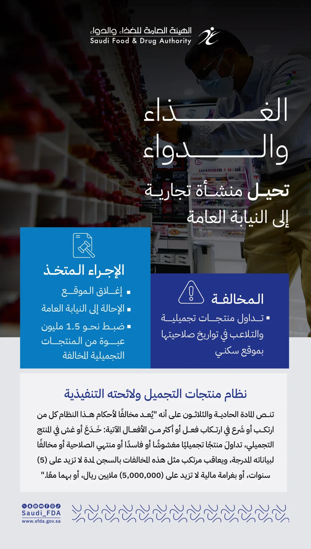 وتنص المادة (31) من نظام منتجات التجميل ولائحته التنفيذية على أنه “يُعد مخالفًا لأحكام هذا النظام كل من ارتكب أو شَرع في ارتكاب فعل أو أكثر من الأفعال الآتية: خَدَعَ أو غش في المنتج التجميلي، تداولَ منتجًا تجميليًا مغشوشًا أو فاسدًا، أو منتهي الصلاحية، أو مخالفًا لبياناته المدرجة، ويعاقب مرتكب مثل هذه المخالفات بالسجن لمدة لا تزيد على (5) سنوات، أو بغرامة مالية لا تزيد على (5,000,000) ريال، أو بهما معًا”.
