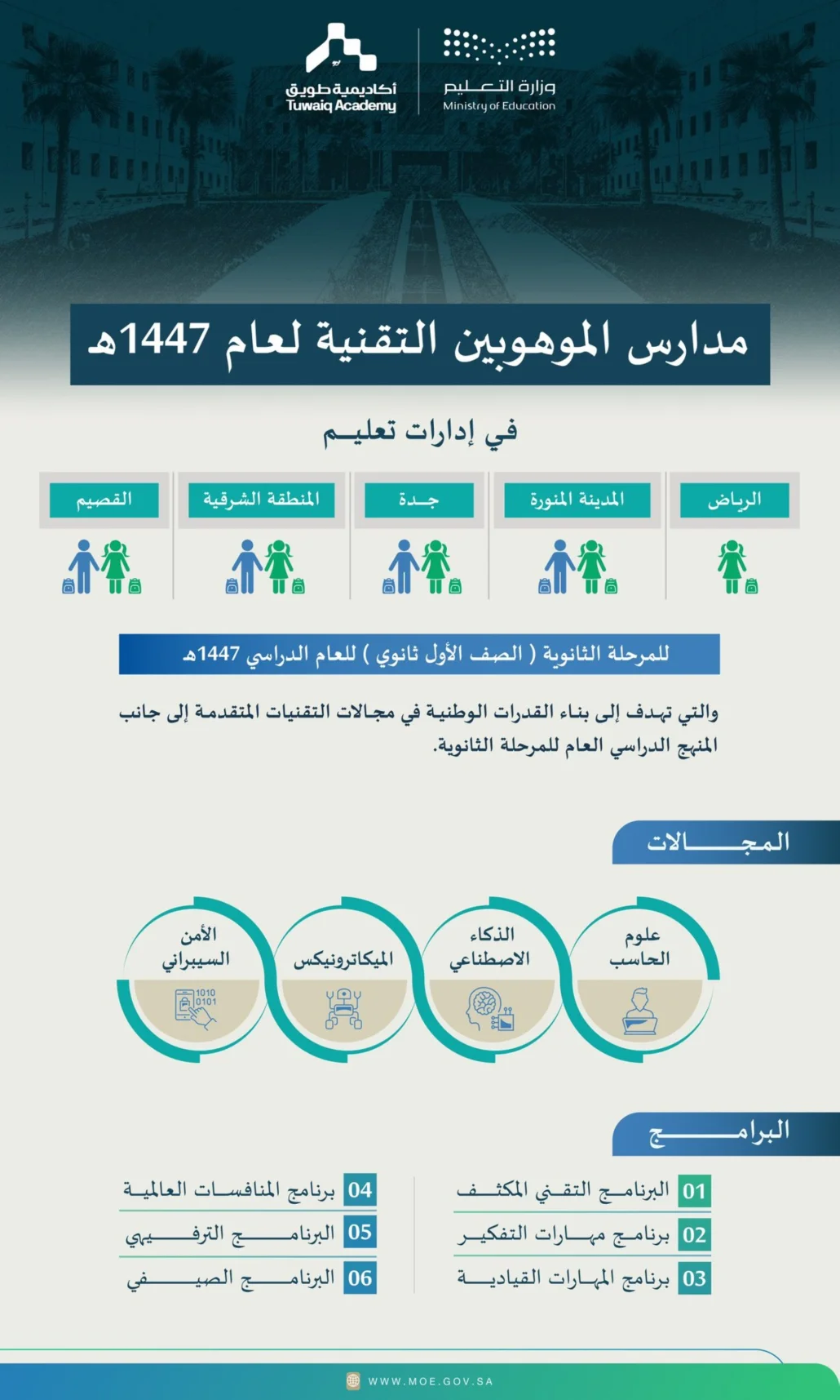 أعلنت وزارة التعليم، بالشراكة مع أكاديمية طويق، افتتاح مدارس الموهوبين التقنية في 5 إدارات تعليمية شملت الرياض، والمدينة المنورة، والمنطقة الشرقية، والقصيم، وجدة، وذلك بدءًا من العام الدراسي 1447هـ، مخصصة لطلاب وطالبات الصف الأول الثانوي.