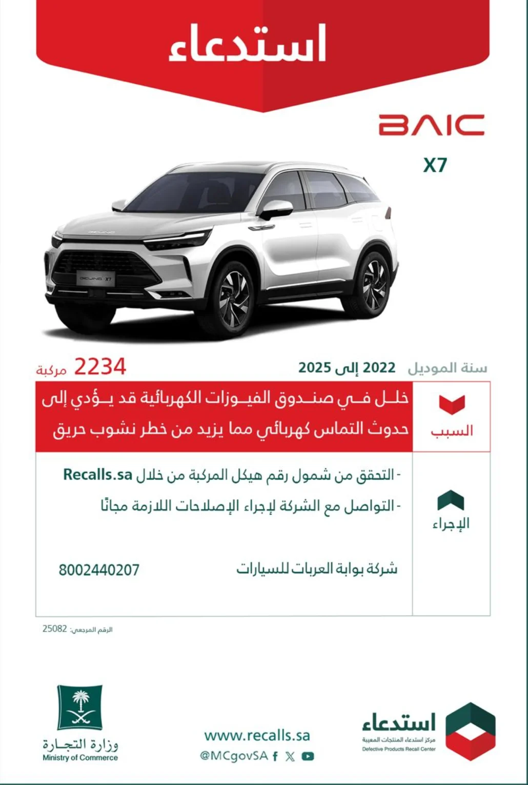 أعلنت وزارة التجارة، اليوم (الأربعاء)، استدعاء 2234 سيارة بايك “BAIC” طراز X7 موديلات (2022 – 2024)؛ لخللٍ في صندوق الفيوزات الكهربائية، قد يؤدي إلى حدوث تماس كهربائي؛ مما يزيد من خطر نشوب حريق.
