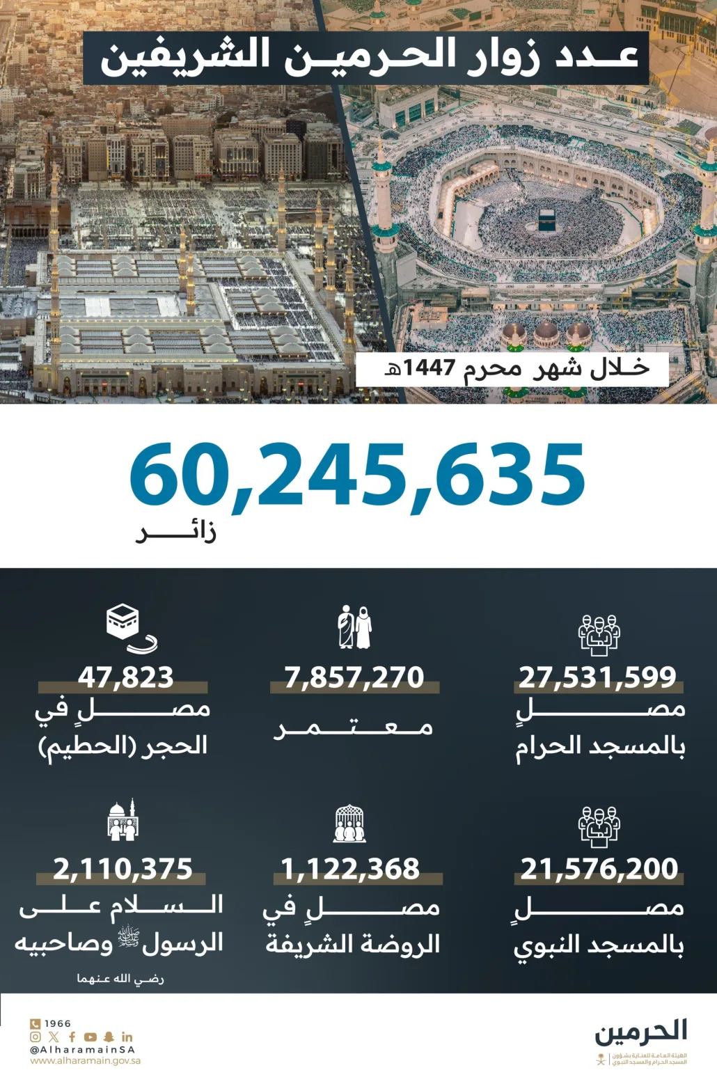 أعلنت الهيئة العامة للعناية بشؤون الحرمين، أن عدد زوار الحرمين الشريفين خلال شهر محرم 1447، هـ تجاوز 60 مليون زائر، توافدوا لأداء مناسكهم وعبادتهم.