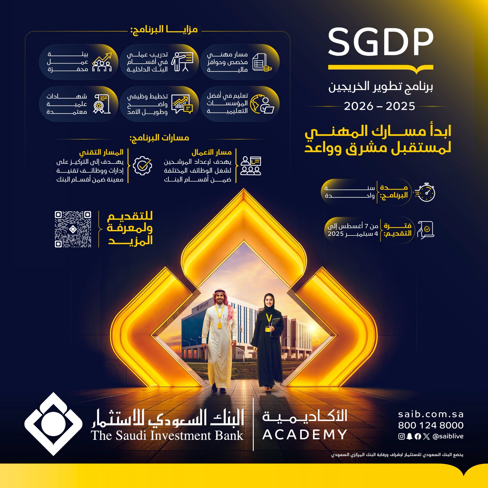 أعلن البنك السعودي للاستثمار عن فتح باب التسجيل في برنامج تطوير الخريجين (SGDP)، والذي يهدف إلى بناء وتطوير المواهب السعودية الواعدة وتجهيزهم بمسار وظيفي طويل الأمد في القطاع المصرفي، وذلك وفقاً للتفاصيل الموضحة أدناه.