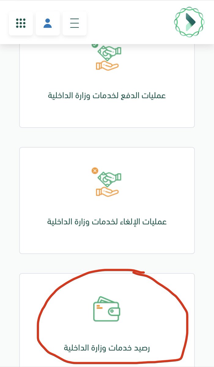 اختر رصيد خدمات وزارة الداخلية ( كما هو موضح في الصورة ادناه ) .