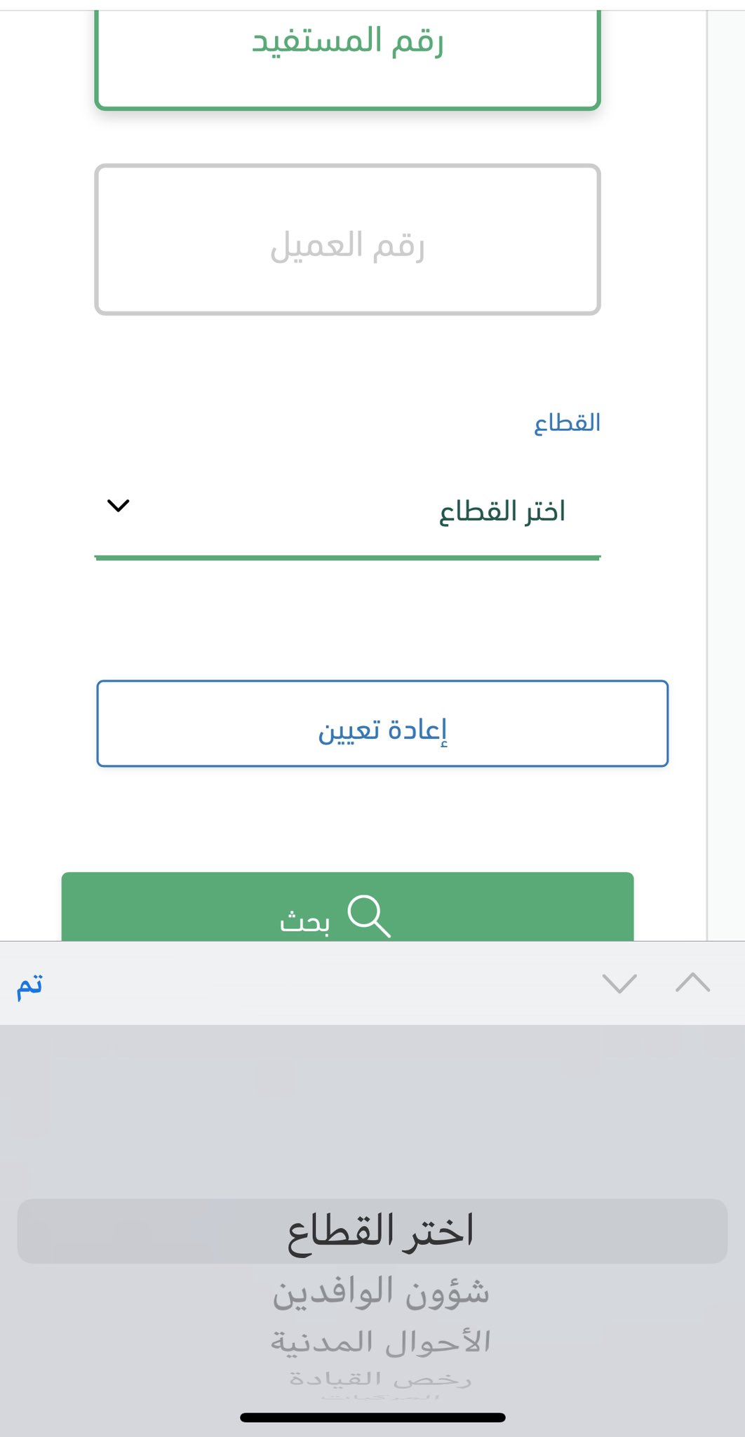ومن ثم ستظهر لك هذه الصفحة ويوجد بها خيارين للبحث : اما عند طريق رقم المستفيد او رقم العميل ، اختر رقم المستفيد .