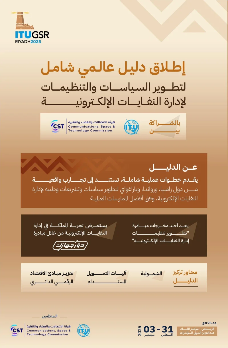 أعلنت هيئة الاتصالات والفضاء والتقنية، بالشراكة مع الاتحاد الدولي للاتصالات، عن إطلاق “دليل عالمي شامل لتطوير السياسات والتنظيمات الإلكترونية لإدارة النفايات الإلكترونية”، والذي يهدف إلى دعم الجهات الحكومية في الدول النامية لتطوير سياسات وتشريعات وطنية لإدارة النفايات الإلكترونية، وفق أفضل الممارسات العالمية، وذلك بالتزامن مع استضافة المملكة للندوة العالمية لمنظمي الاتصالات GSR25.