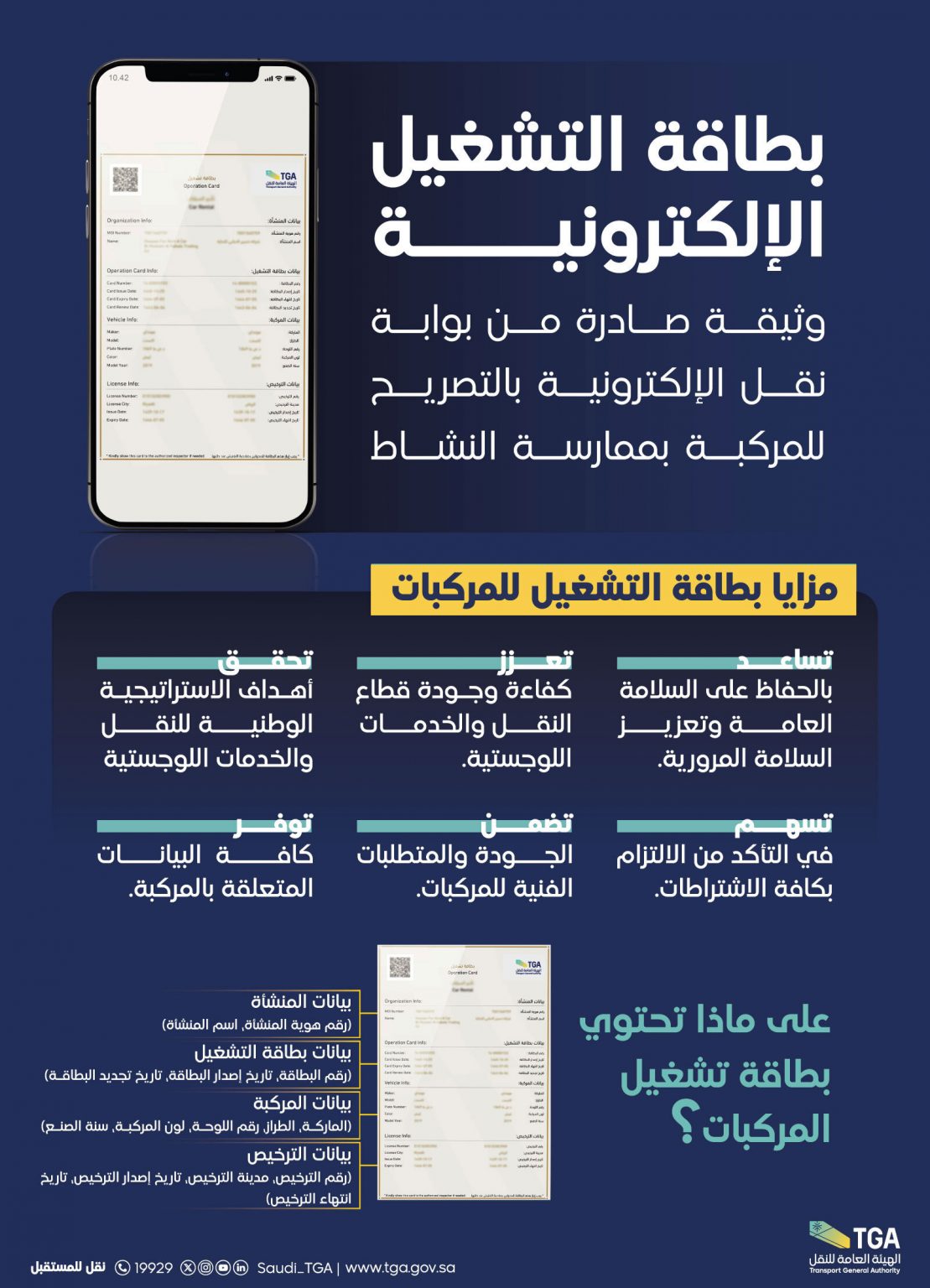 أوضحت هيئة النقل أن بطاقة التشغيل الإلكترونية للمركبات هي عبارة عن وثيقة صادرة من بوابة نقل الإلكترونية، تمنح المركبة تصريح بممارسة النشاط في قطاع النقل البري، وتتضمن جميع البيانات المتعلقة بالمركبة.