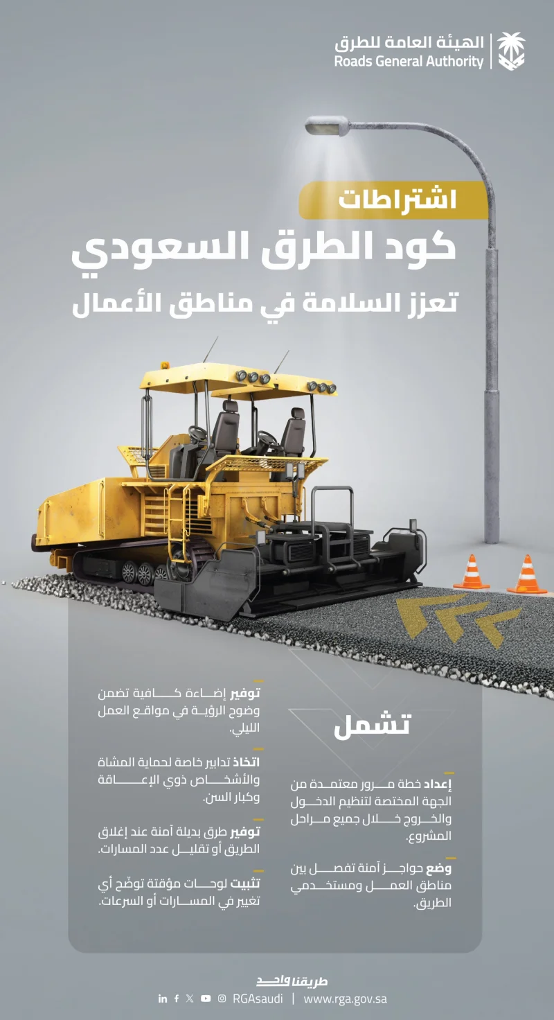 كما شملت الاشتراطات ضرورة توفير إضاءة كافية في مواقع العمل الليلية لضمان وضوح الرؤية، واتباع تدابير خاصة لحماية المشاة، كبار السن، والأشخاص ذوي الإعاقة، بما يتماشى مع أفضل الممارسات في مجال السلامة المرورية.