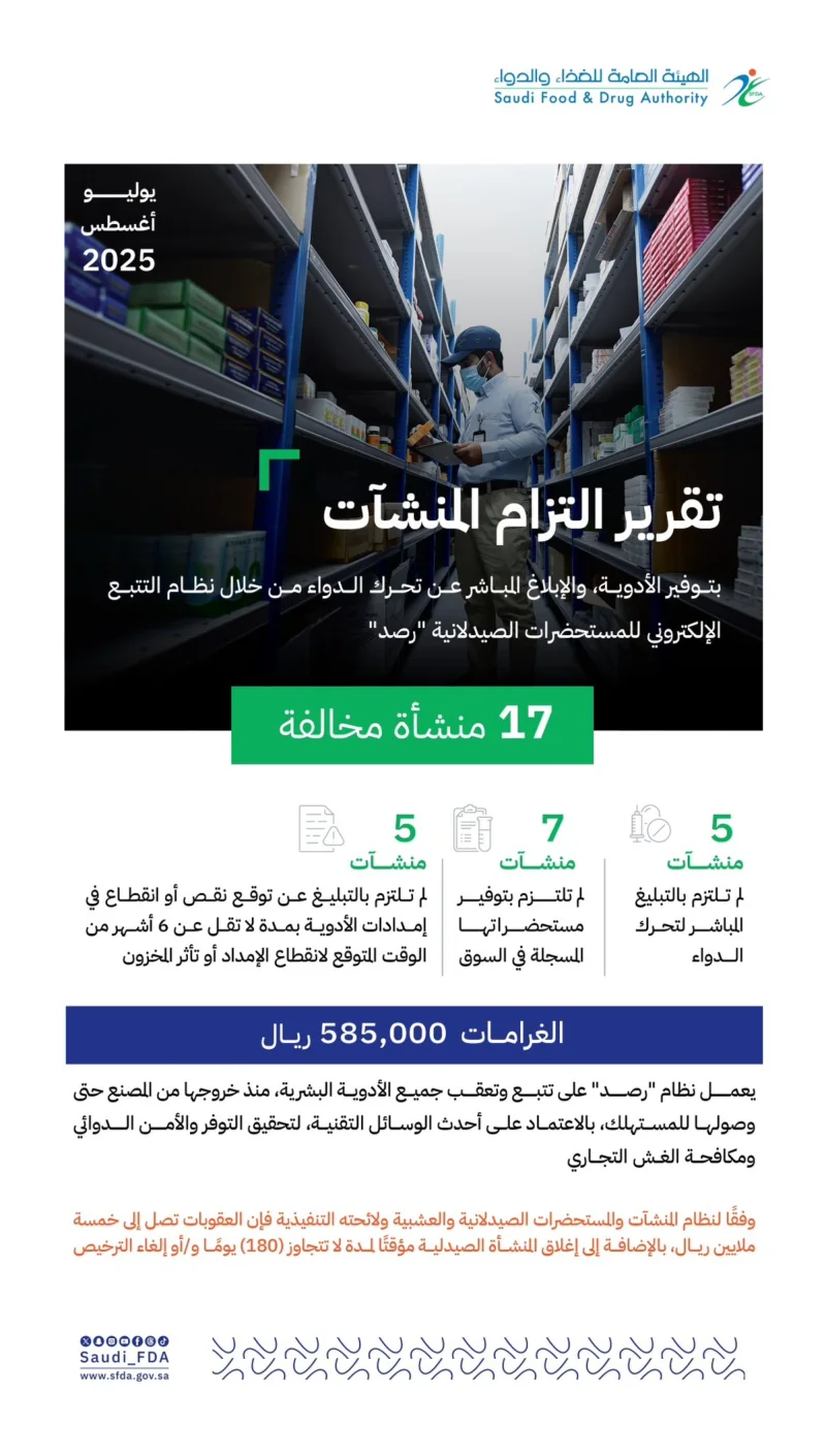 وبيّنت الهيئة أن المنشآت المخالفة شملت 5 منشآت لم تلتزم بالتبليغ المباشر لتحرك الدواء، و7 منشآت لم تلتزم بتوفير مستحضراتها المسجلة في السوق، و5 منشآت لم تلتزم بالتبليغ عن توقع نقص أو انقطاع في إمدادات الأدوية بمدة لا تقل عن 6 أشهر من الوقت المتوقع لانقطاع الإمداد أو تأثر المخزون.