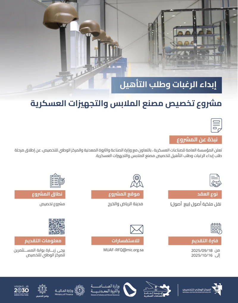 أطلقت المؤسسة العامة للصناعات العسكرية، مرحلة طلب إبداء الرغبة وطلب التأهيل لتخصيص مصنع الملابس والتجهيزات العسكرية في الرياض والخرج، وذلك بالتعاون مع وزارة الصناعة والثروة المعدنية والمركز الوطني للتخصيص.