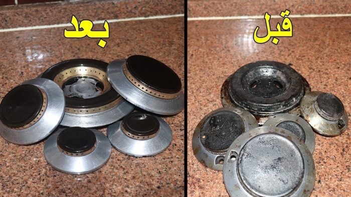 1- في البداية نقوم بإزالة عيون البوتجاز ويتم نقعها في محلول من الماء والملح والصابون السائل.