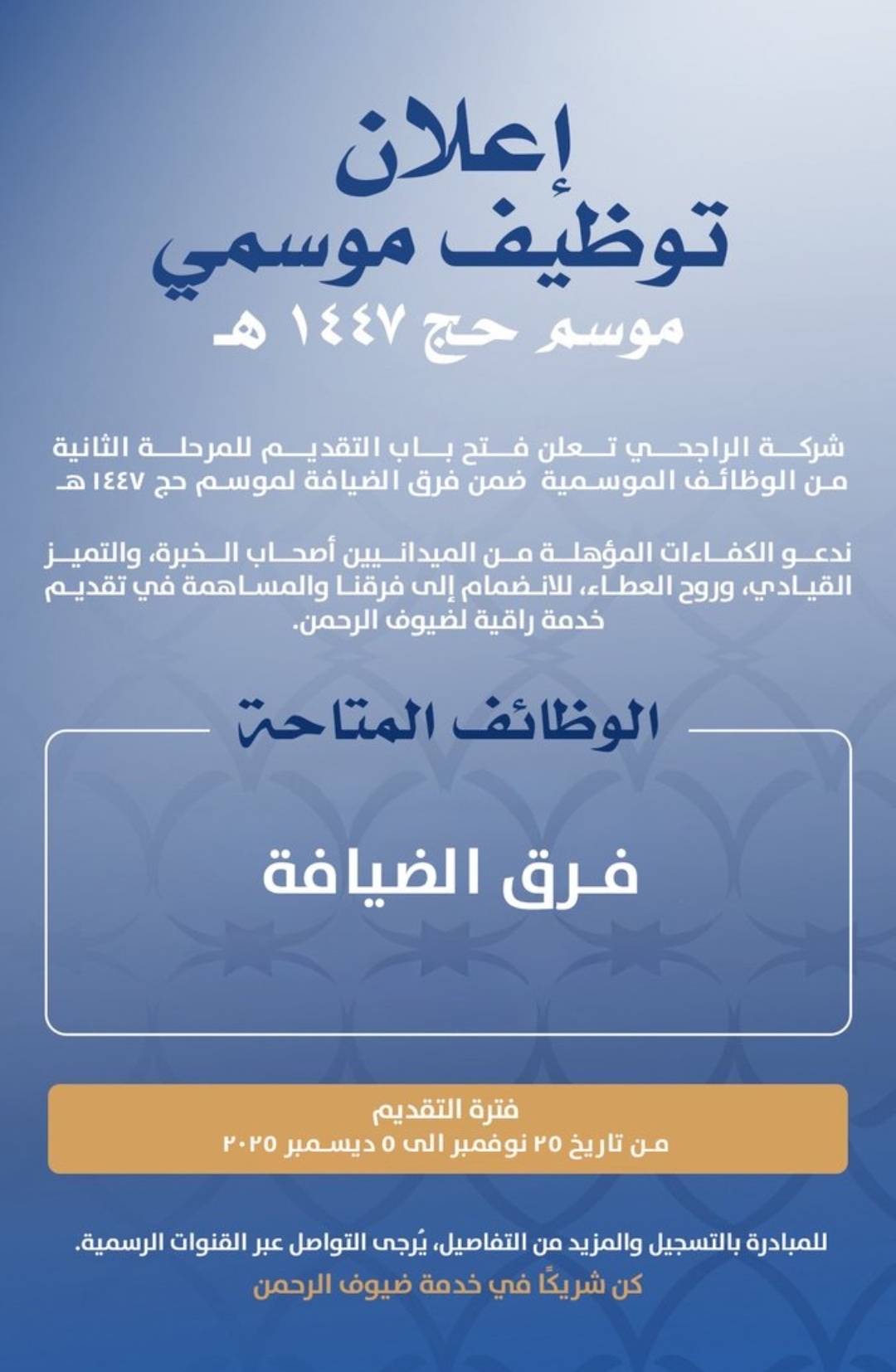 أعلنت شركة الراجحي فتح باب التقديم للمرحلة الثانية من الوظائف الموسمية ضمن فرق الضيافة لموسم حج 1447هـ، داعيةً الكفاءات المؤهلة للمساهمة في تقديم خدمة راقية لضيوف الرحمن، وذلك وفقاً للتفاصيل الموضحة أدناه.