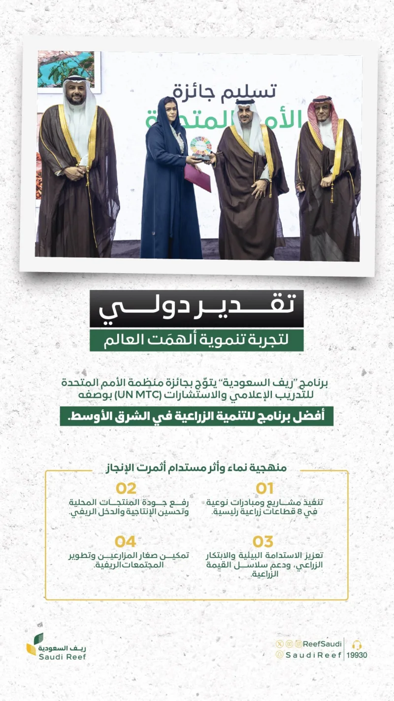 حصل برنامج التنمية الريفية الزراعية المستدامة (ريف السعودية) على جائزة أكبر برنامج زراعي تنموي في الشرق الأوسط من الأمم المتحدة، تقديرًا لجهوده المتميزة في تطوير القطاع الريفي وتعزيز الاستدامة الزراعية في المملكة.