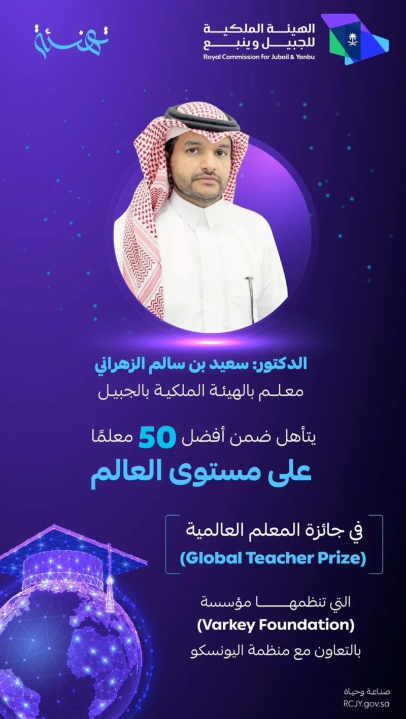 تأهل المعلم بالهيئة الملكية بالجبيل، سعيد الزهراني، ضمن أفضل 50 معلمًا على مستوى العالم في جائزة المعلم العالمية.