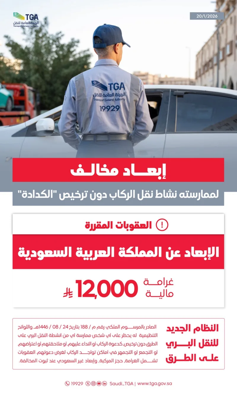 وأبانت أن العقوبات المقررة تشمل الغرامة المالية التي تصل إلى 12 ألف ريال، وحجز المركبة، وإبعاد المخالف غير السعودي عند ثبوت المخالفة، خاصةً في حالات ممارسة نقل الركاب، أو الدعاء عليهم، أو ملاحقتهم، أو اعتراضهم، أو التجمع في أماكن تواجد الركاب لعرض دعوتهم.