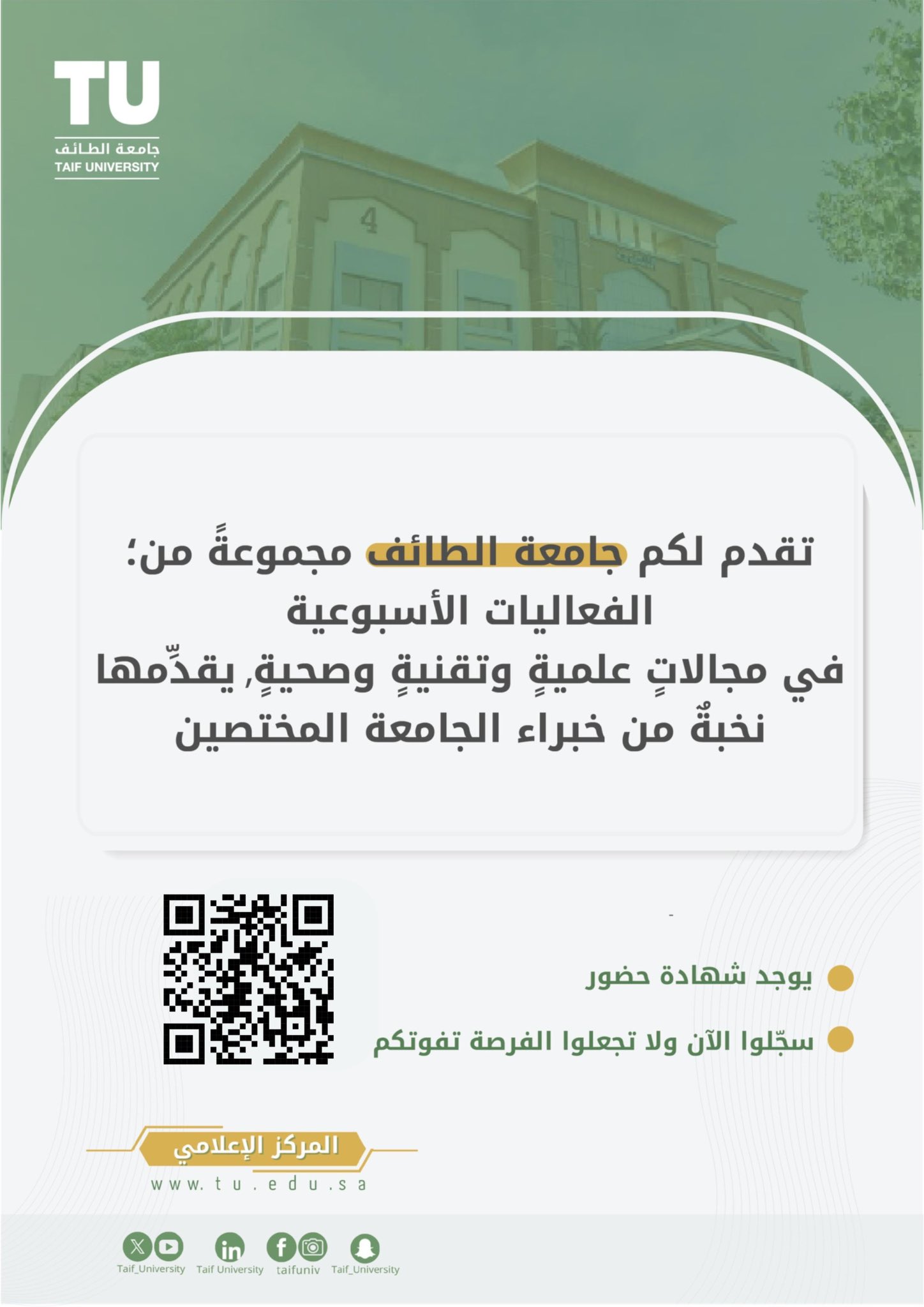 أعلنت جامعة الطائف عن تقديم مجموعة من الفعاليات الأسبوعية (عن بُعد) في مجالات اقتصادية وتقنية ومهارية وصحية، يقدمها نخبة من خبراء الجامعة المختصين في مختلف المجالات العلمية والعملية، مع منح المشاركين شهادات حضور معتمدة، وذلك وفقاً للتفاصيل الموضحة أدناه.