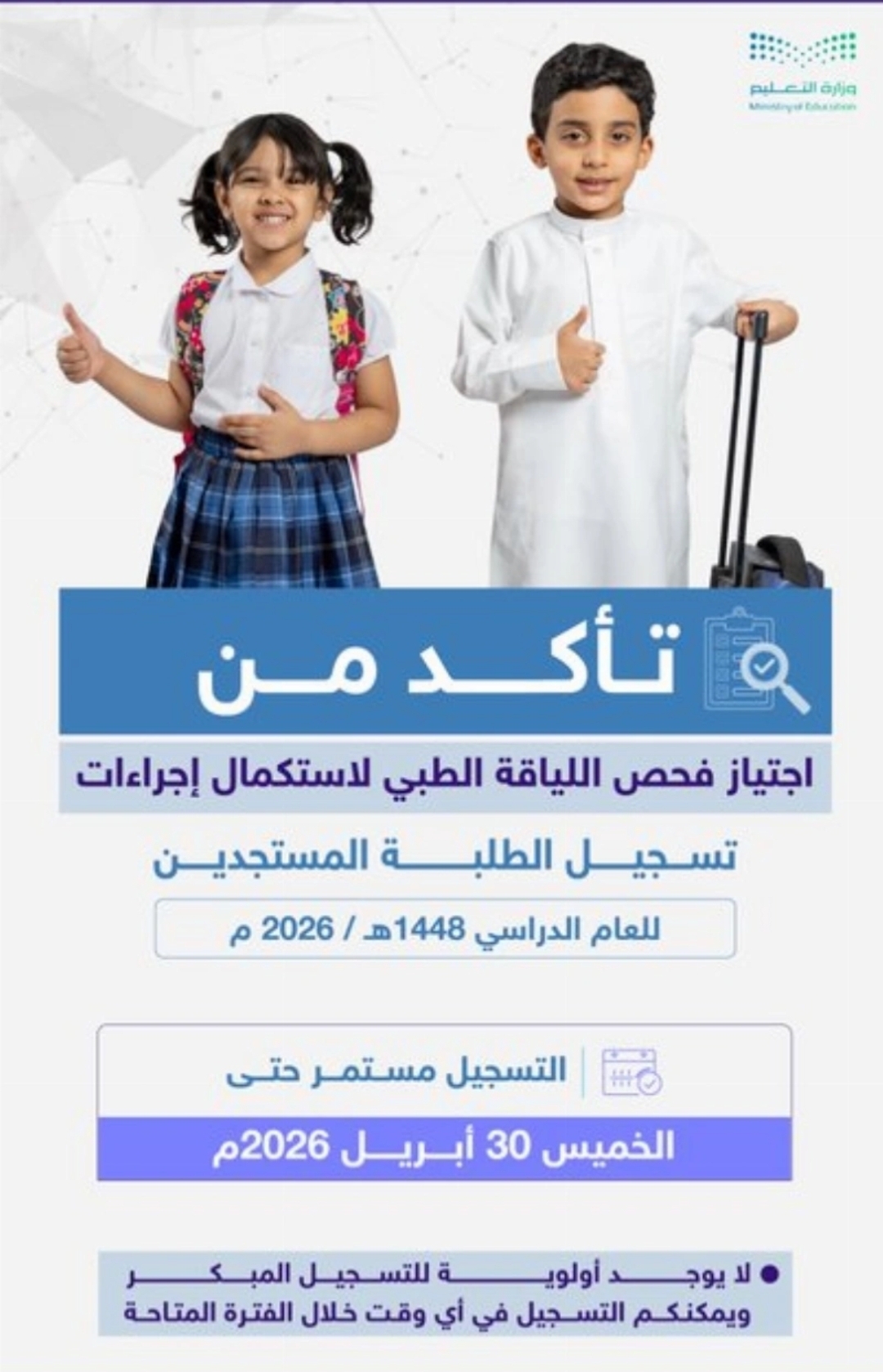 أتاحت وزارة التعليم باب تسجيل الطلاب المستجدين في المدارس الابتدائية ورياض الأطفال للعام الدراسي القادم 1448هـ، وذلك اعتبارا من اليوم وحتى 30 أبريل الجاري.