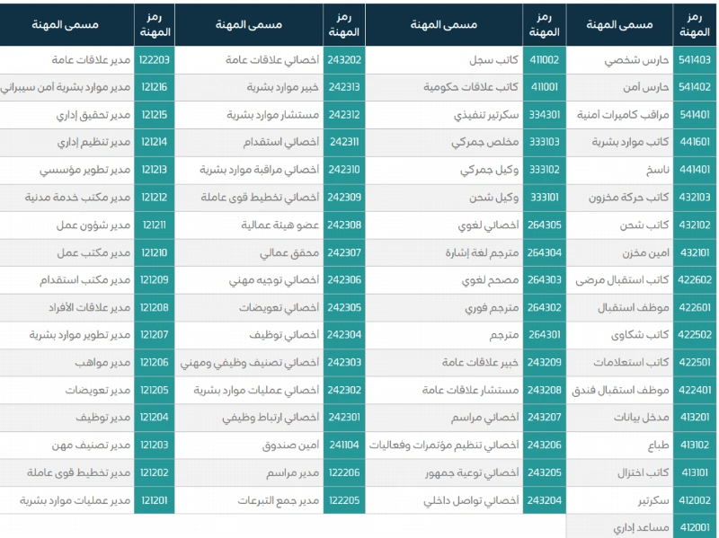 ويتم تطبيق القرار على جميع المهن المستهدفة والمنصوص عليها في الموقع، ومن بينها: مدير موارد بشرية أمن سيبراني، مدير تحقيق إداري، مدير تعويضات، مدير تصنيف مهن، مدير مراسم، أخصائي تعويضات، عضو هيئة عمالية، محقق عمالي. كما شملت خبير علاقات عامة، مستشار علاقات عامة، أخصائي توعية جمهور، أخصائي تنظيم مؤتمرات وفعاليات، مترجم فوري، مترجم لغوي، كاتب اختزال، مدير علاقات الأفراد.