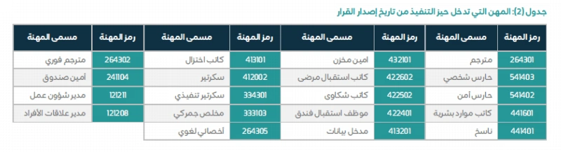 وذكرت الموارد البشرية المهن التي تدخل حيز التنفيذ من تاريخ إصدار القرار، وتشمل: مترجم، حارس شخصي، حارس أمن، كاتب موارد بشرية، ناسخ، أمين مخزن، كاتب استقبال مرضى، كاتب شكاوى، موظف استقبال فندق، مدخل بيانات، كاتب اختزال، سكرتير، سكرتير تنفيذي، مخلص جمركي، أخصائي لغوي، مترجم فوري، أمين صندوق، مدير شؤون عمل، إضافةً إلى مدير علاقات الأفراد.