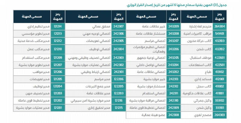 وشملت المهن الممنوحة 6 أشهر مهلة: محقق عمال، أخصائي توجيه مهني، أخصائي تعويضات، أخصائي توظيف، أخصائي تصنيف وظيفي ومهني، أخصائي عمليات موارد بشرية، أخصائي ارتباط وظيفي، مدير مراسم، مدير جمع التبرعات، مدير علاقات عامة، مدير موارد بشرية أمن سيبراني، مدير تحقيق إداري، مدير تنظيم إداري، مدير تطوير مؤسسي، مدير مكتب خدمة مدنية، مدير مكتب عمل، مدير مكتب استقدام، مدير تطوير موارد بشرية، مدير مواهب، مدير تعويضات، مدير توظيف، مدير تصنيف مهن، مدير تخطيط قوى عاملة، ومدير عمليات موارد بشرية.