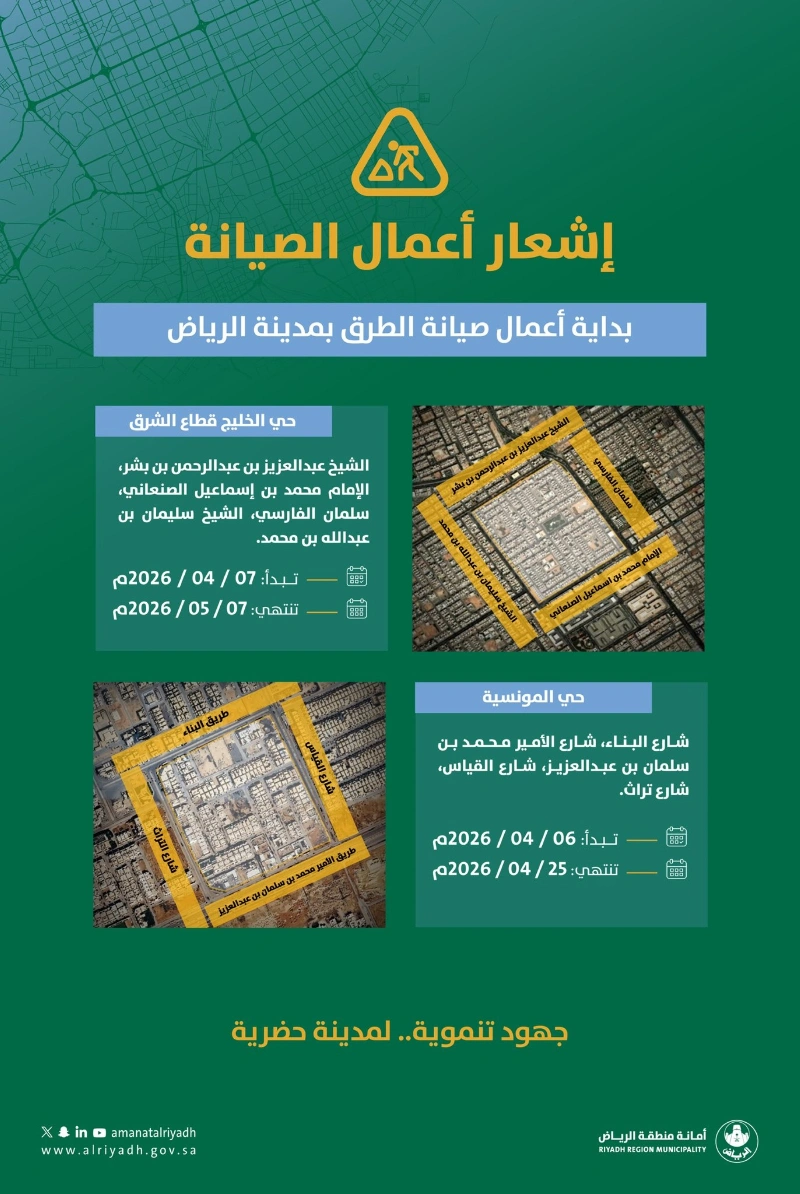 كما تمتد أعمال الصيانة إلى حي المونسية، وتشمل طرق: شارع البناء، وشارع الأمير محمد بن سلمان بن عبدالعزيز، وشارع القياس، وشارع تراث، على أن تبدأ الأعمال في 6 أبريل 2026 وتنتهي في 25 أبريل 2026.