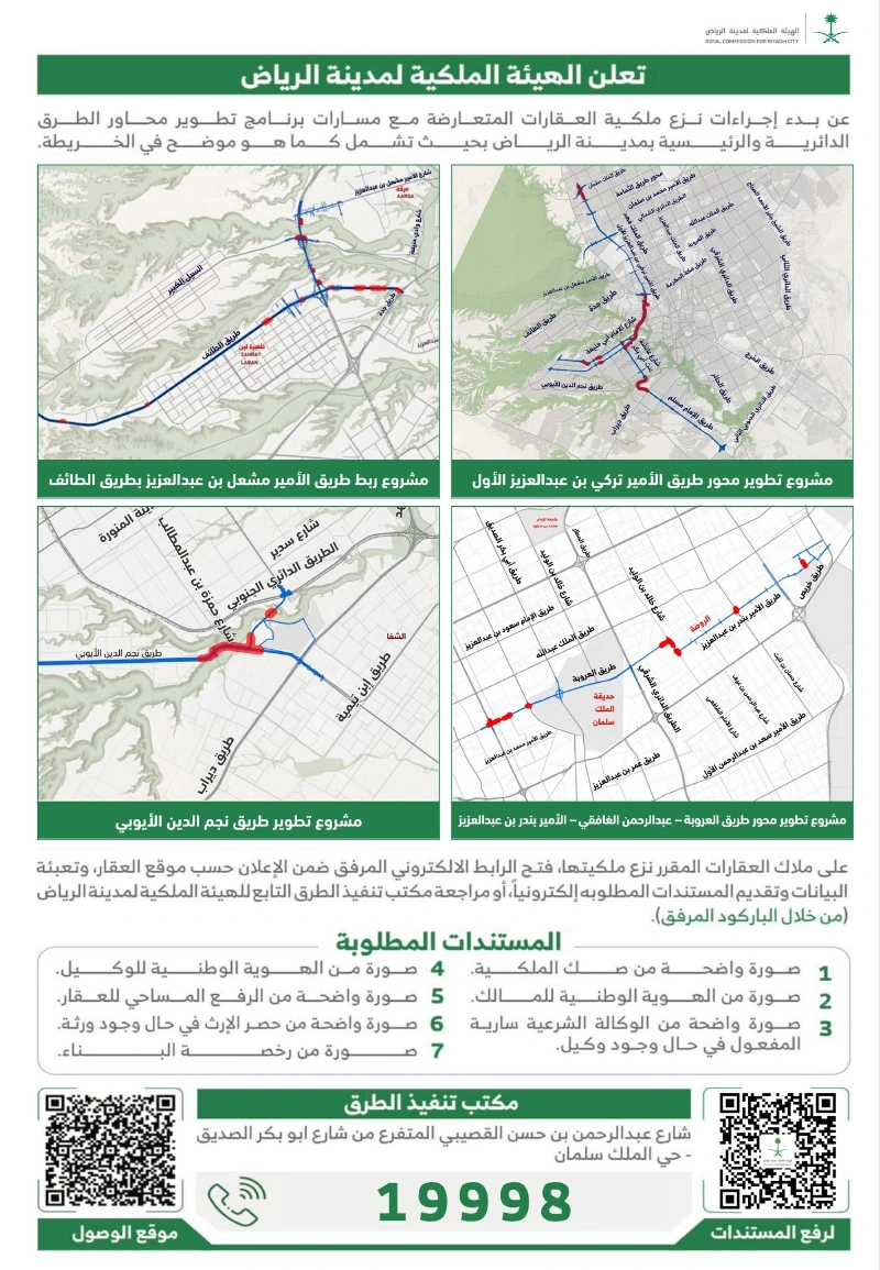 ودعت ملاك العقارات المشمولة إلى التقديم عبر الرابط الإلكتروني المخصص وفق موقع العقار، وتعبئة البيانات، وإرفاق المستندات المطلوبة، أو مراجعة مكتب تنفيذ الطرق التابع للهيئة.