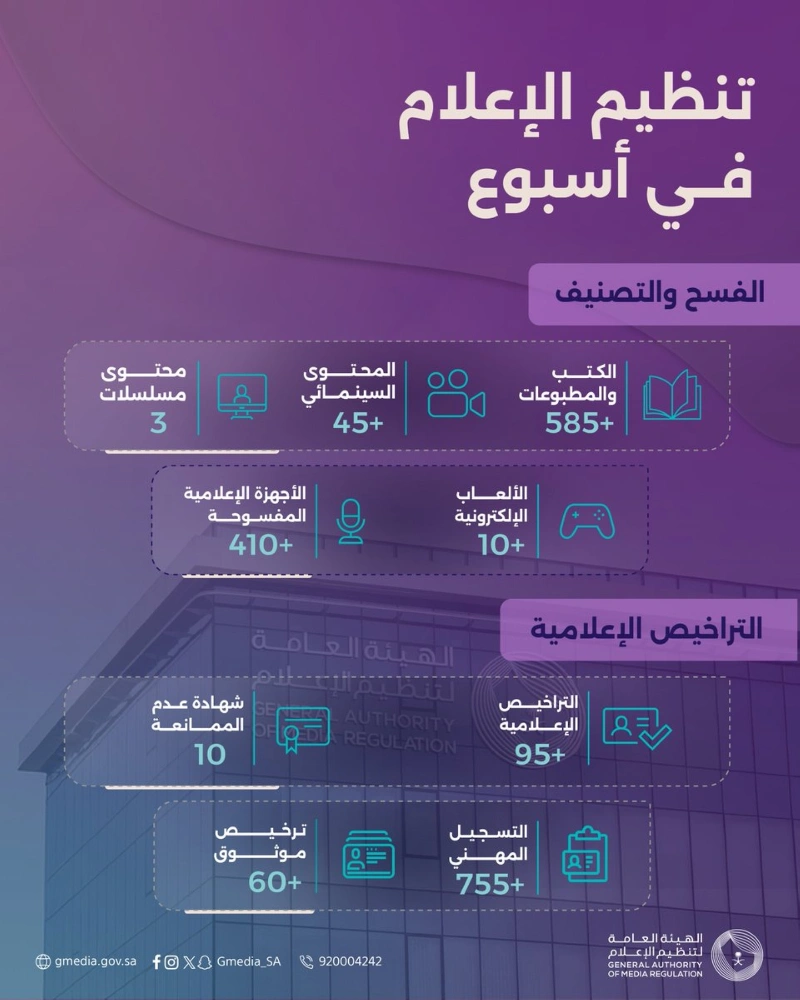 وأشارت إلى إصدار 95 ترخيصًا إعلاميًّا، و10 شهادات عدم ممانعة، و755 تسجيلاً مهنيًّا، و60 ترخيصاً موثوقاً.