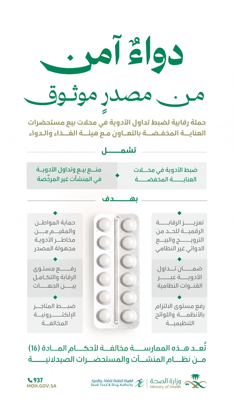 وتهدف الحملة إلى تعزيز الرقابة للحد من الترويج والبيع الدوائي غير النظامي، بما يسهم في تداول الأدوية عبر القنوات النظامية، ورفع مستوى الالتزام بالأنظمة واللوائح التنظيمية، بما يسهم في حماية المواطن والمقيم من مخاطر الأدوية مجهولة المصدر، وتعزيز التكامل الرقابي بين الجهات.