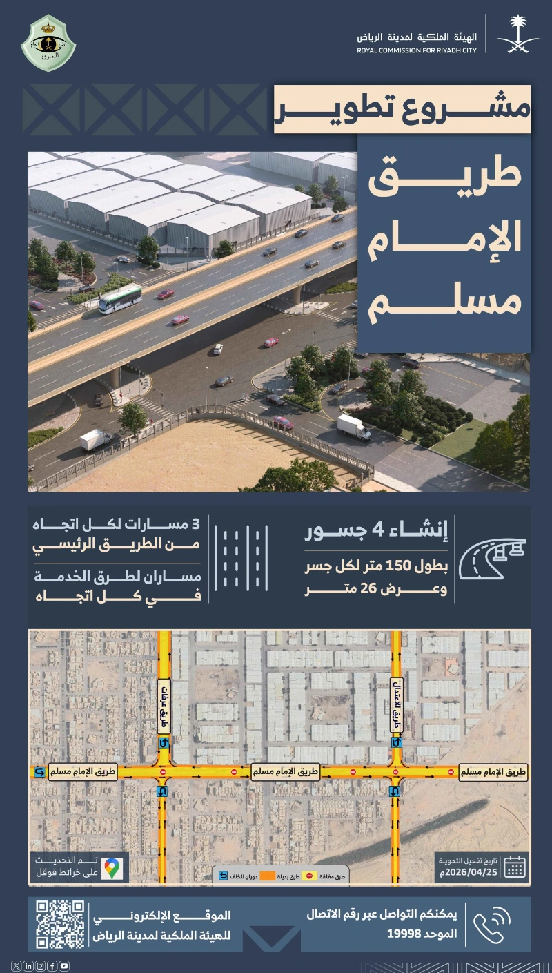 ونبهت بأنه سيتم تفعيل تحويلة مرورية جديدة مع استمرار الإغلاق في نطاق طريق الإمام مسلم عند تقاطعي طريق الاعتدال وطريق عرفات، وتحويل حركة السير إلى طرق الخدمة والمسارات البديلة المهيأة، بما يضمن استمرار الحركة المرورية خلال فترة التنفيذ.