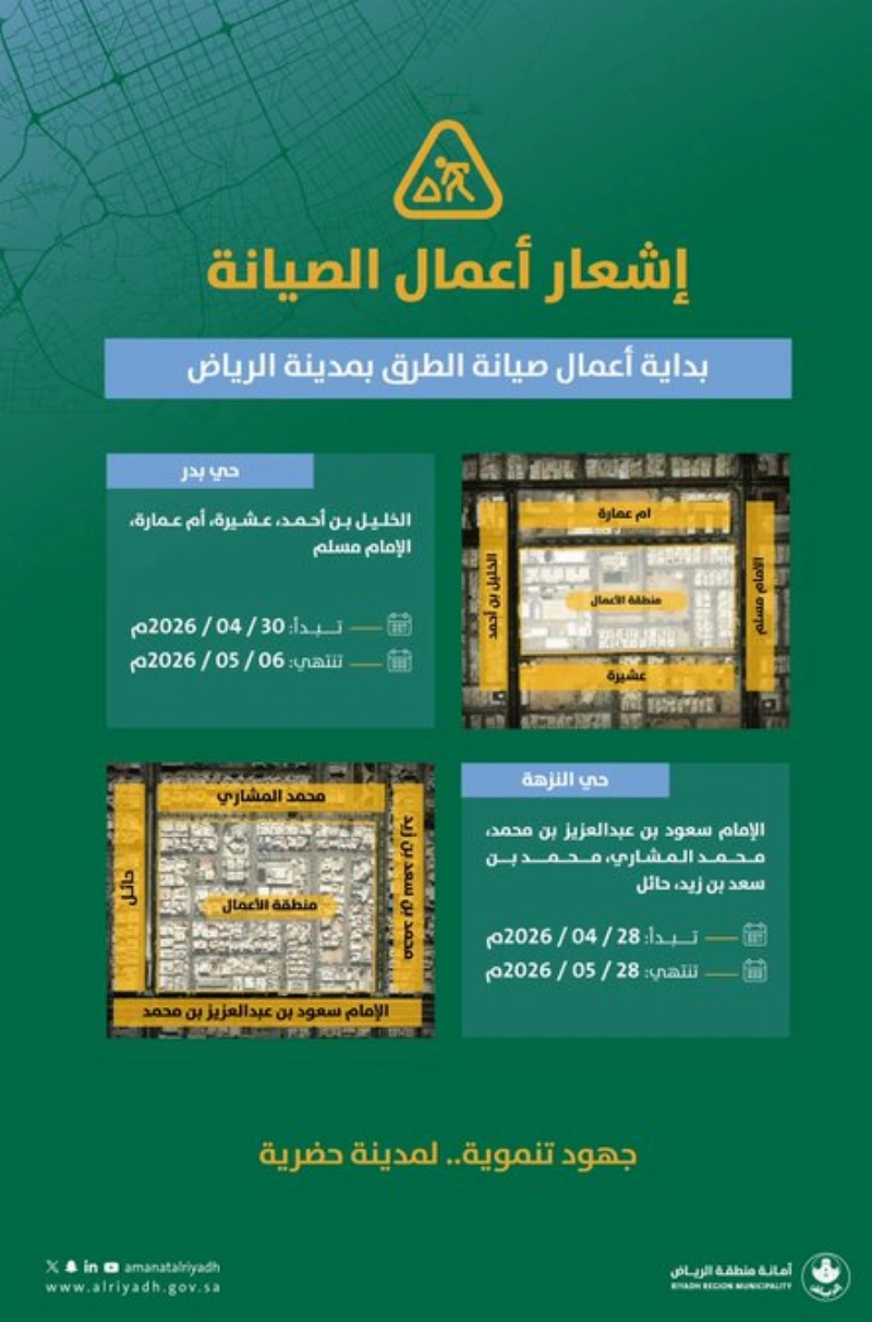 وأوضحت أمانة المنطقة أن أعمال الصيانة في حي بدر تشمل الطرق الواقعة في نطاق شوارع الخليل بن أحمد وعشيرة وأم عمارة، والإمام مسلم، وتبدأ أعمال الصيانة من 30 إبريل الجاري وحتى 6 مايو المقبل.