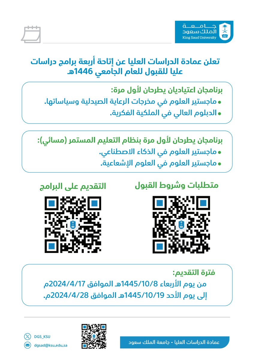 أعلنت جامعة الملك سعود مُمثلة في عمادة الدراسات العليا عن طرح 4 برامج جديدة للدراسات العليا للقبول للعام الجامعي 1446هـ، وذلك وفقًا للتفاصيل وطريقة التقديم الموضحة أدناه.