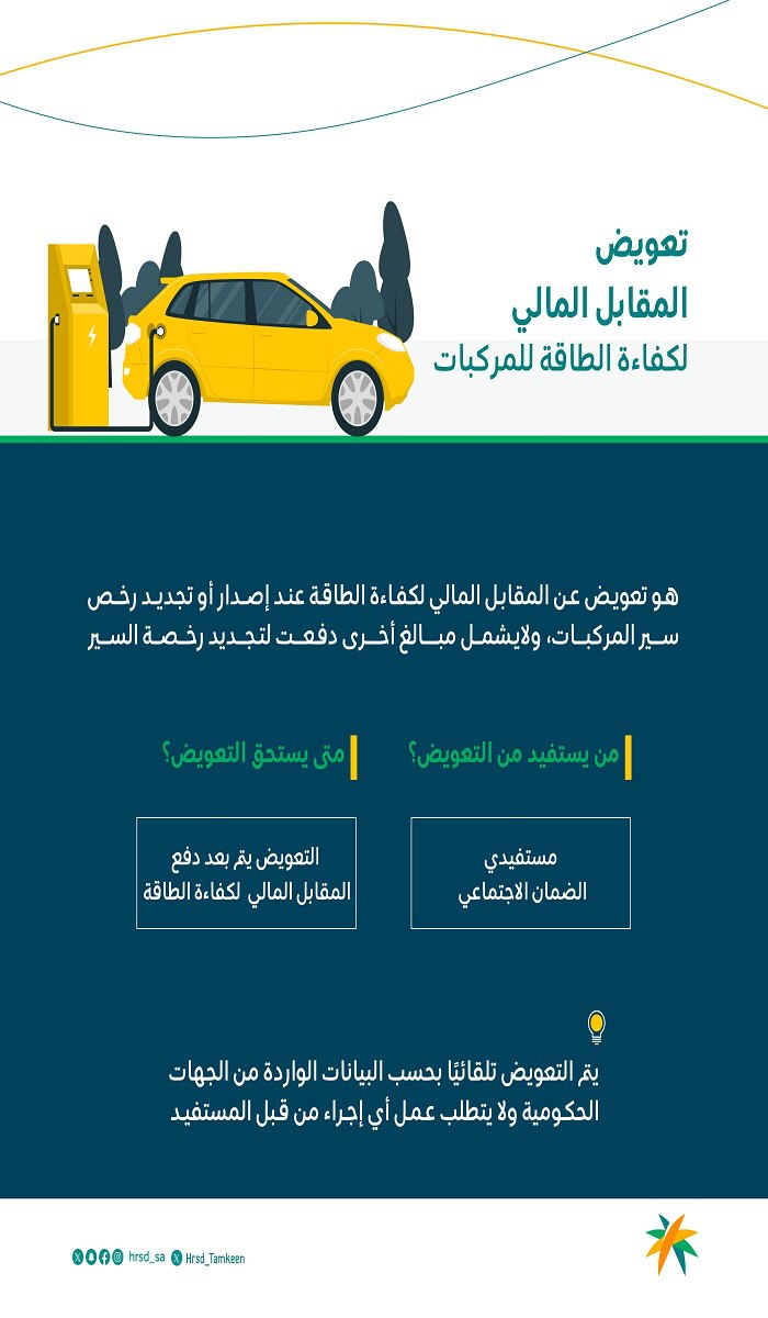 من خلال صفحته الرسمية على منصة تويتر قام الضمان الاجتماعي والتمكين بتعريف متى يتم تعويض مستفيدي الضمان عن المقابل المالي لكفاءة الطاقة وأكد على أن تعويض مستفيدي الضمان يتم في حال إصدار أو تجديد رخص سير المركبات، ولا يشمل أي مبالغ أخرى تم دفعها لتجديد الرخصة ويستفيد مستفيدي الضمان الاجتماعي ويتم التعويض بشكل تلقائي